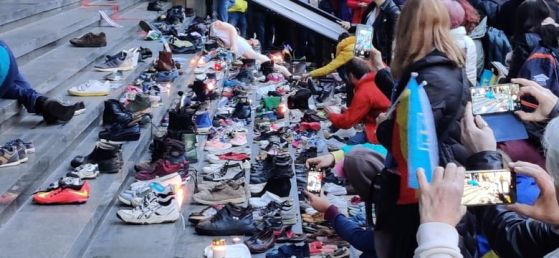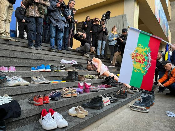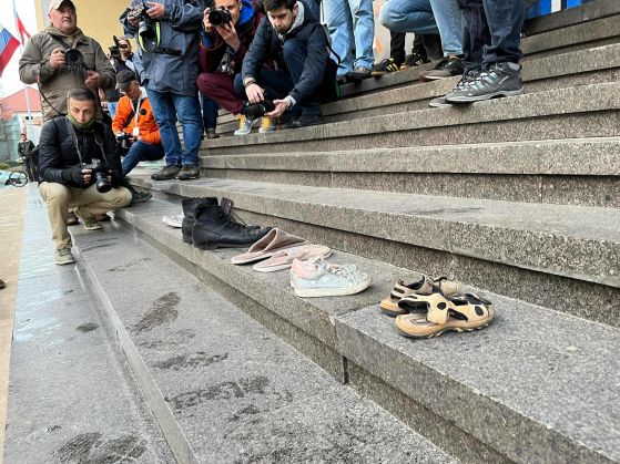 19:39 ч. - Шествието стигна до Руския културно-информационен център. Провокатори, скандиращи " фашисти ", бяха изведени от полицията, а жителите оставят обувки пред центъра в памет на жертвите в Украйна.