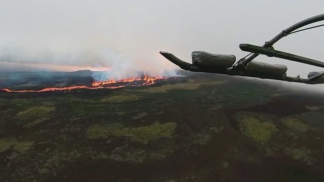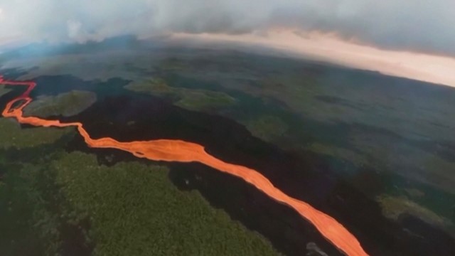 Кадри, снимани от въздуха, демонстрират дългата линия на лавата, която се спуска от кратера.
