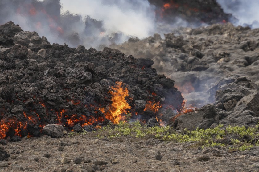 Вулканичната лава изгаря зелена растителност в профил на пътя покрай Гриндавик, Исландия след изригването на вулкана.