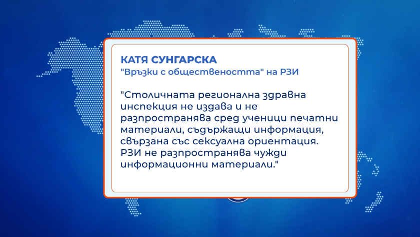 " Столичната районна здравна ревизия не издава и не популяризира измежду възпитаници печатни материали, съдържащи информация, обвързвана със полова ориентировка. РЗИ не популяризира непознати осведомителни материали ", съобщи Катя Сунгарска, " Връзки с обществеността " на РЗИ.