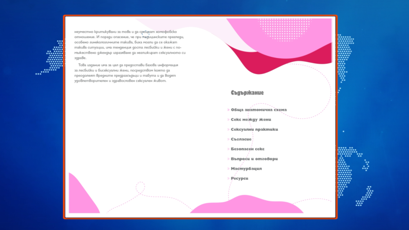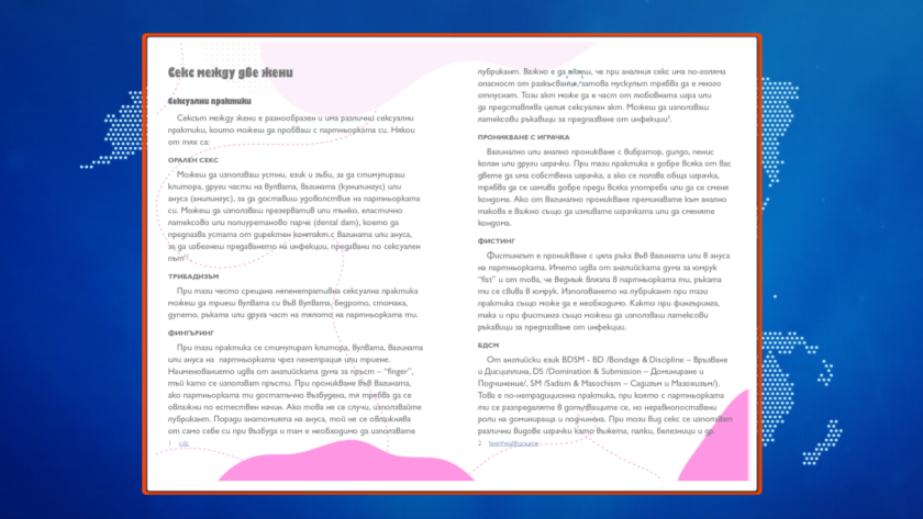 " Това, уважаеми сътрудници, е " Сексуално здраве за лесбийки и бисексуални дами " в българска гимназия, в лекарския кабинет на българската гимназия и се дава на децата да се ограмотяват по какъв начин се прави секс сред лесбийки и бисексуални дами. На българските деца ".