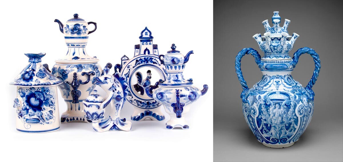 Legion Media; Музей на изкуствата „Метрополитън“ Прочутата синьо-бяла порцеланова орнаментика в гжел се появява за първи път в Русия по времето на Петър I. Този кобалтов орнамент е направен „по холандски“, тъй като дружно с всички други европейски заемки на съветския цар в Русия се появява „синият Делфт“ – специфичен жанр на изобразяване на майсторите от град Делфт в Холандия.
