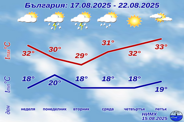 Вятърът ще е слаб до сдържан от югоизток. Преобладаващите оптимални температури в страната ще бъдат сред 31 и 36 градуса, съгласно прогнозата на Национален институт по метеорология и хидрология.