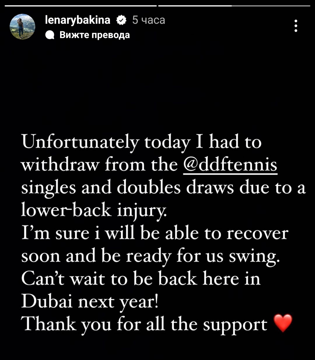 " За страдание, през днешния ден би трябвало да се откажа от присъединяване си на сингъл и двойки на шампионата в Дубай заради контузия в кръста. Сигурна съм, че ще мога да се възстановя час по-скоро и да съм подготвена за американското турне. Нямам самообладание да бъда още веднъж тук в Дубай идната година! Благодаря ви за поддръжката. " - гласи изказването на финалистката от Откритото състезание на Австралия и сегашна международна номер 10.