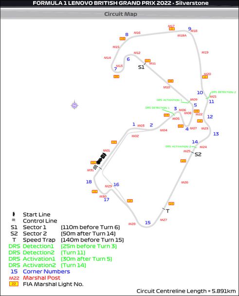 Замерването на разликите между автомобилите преди първата зона е на 25 метра преди третия завой “Вилидж”, а пилотите ще имат право да активират DRS системите си на 50 метра след излизането от завой №5 “Ейнтрий”.