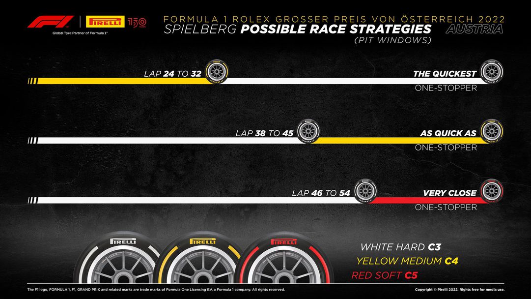 По данните на Пирели от свободните тренировки в петък и събота най-бързията вариант за покриването на дистанцията от 71 обиколки е старт с медиум смесите и слагане на хард между обиколки 24 и 32. Също толкова бърза е и обратната стратегия, която включва старт с хард и спиране за медиум между обиколки 38 и 45.