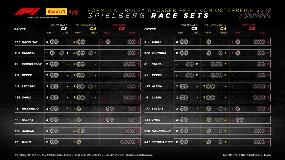 Преди началото на днешното състезание всички пилоти на Ред Бул и Ферари разполагат с по два чисто нови комплекта гуми медиум и хард, а Шарл Леклер има и един чифт вече карани медиум. За сметка на това монегаскът има с един комплект по-малко от вече ползваните софт, като той има два чифта, докато Карлос Сайнц, Макс Верстапен и Серхио Перес имат по три.