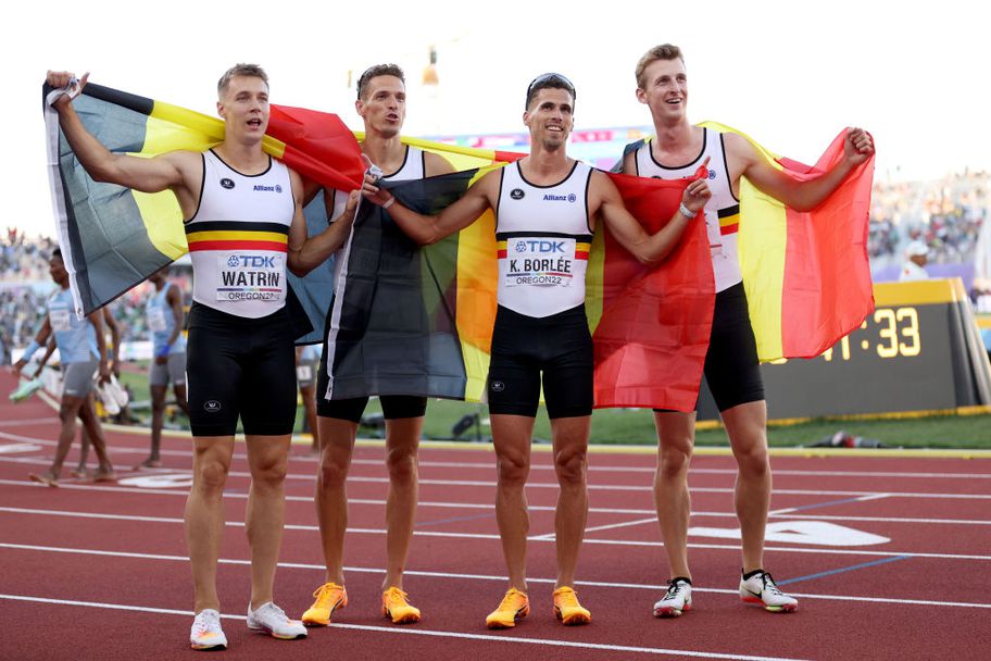 Белгийците защитиха бронзовите си отличия от Доха през 2019 г., след като отново се пребориха за място на подиума с 2:58.72 минути. За европейския квартет бягаха Дилан Борле, Жулиен Ветрен, Александър Доом и Кевин Борле.