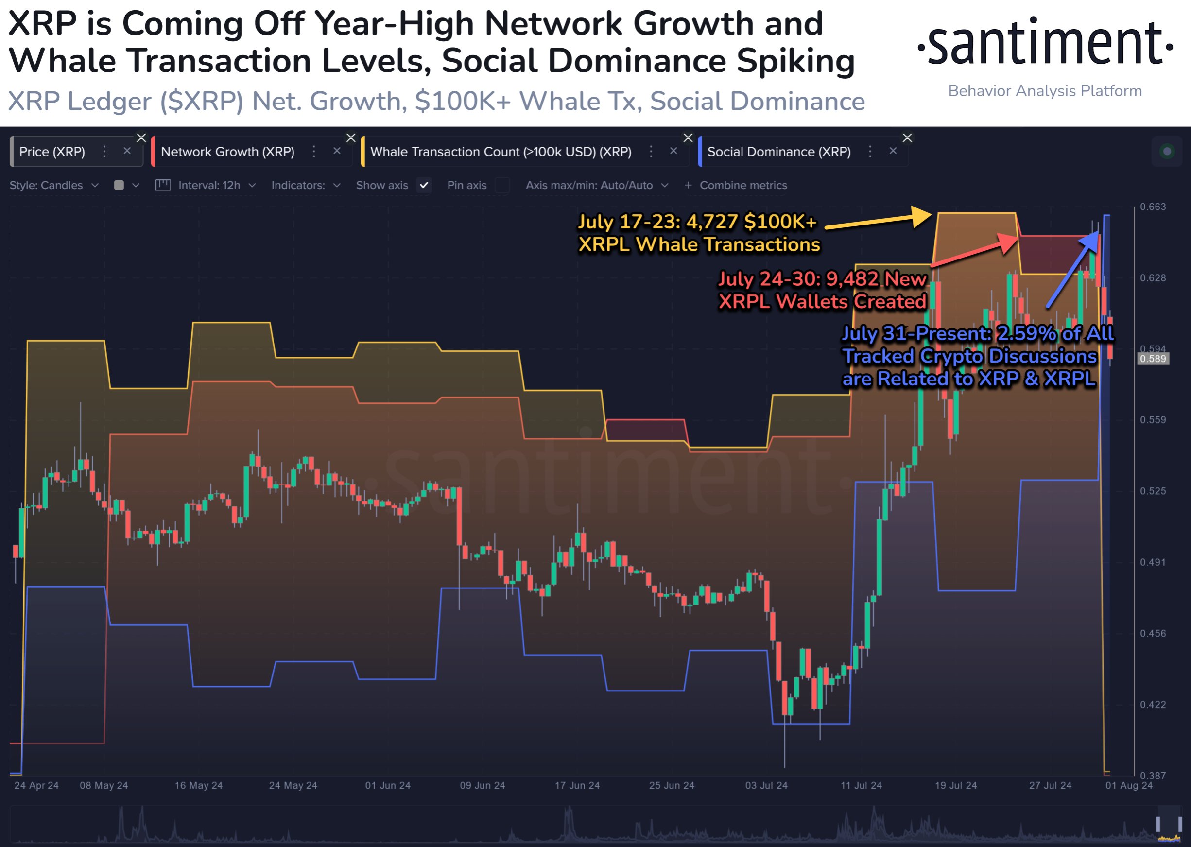 Според компанията за блокчейн разбори Santiment XRP Ledger е отбелязала забележителна интензивност през юли. Цената на XRP се е повишила с 35%, изпреварвайки растежа от 15% на Биткойн . Този растеж се дължеше на разширението на мрежата и увеличението на транзакциите от страна на огромни притежатели, известни като китове. Въпреки това настъпи леко оттегляне на цената.