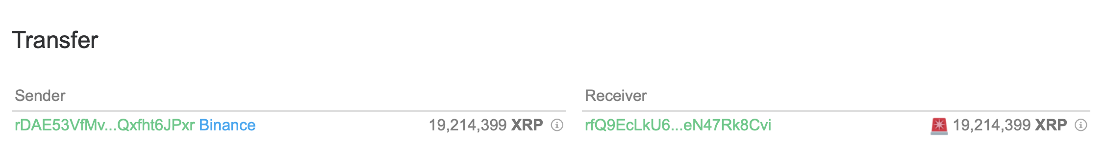 Според данните , предоставени от платформата за следене на блокчейн Whale Alert, два неидентифицирани портфейла са придобили общо 38.7 милиона броя XRP в две обособени транзакции. При първата транзакция са добити 19.21 милиона XRP броя на стойност $12.03 милиона през Binance от неизвестен портфейл.