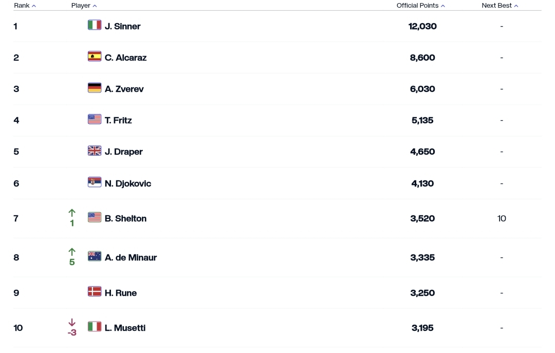 Бен Шелтън пък продължава да изкачва нови тенис върхове и е новият международен номер 7 (рекордно класиране), разполагайки с актив от 3520 пункта, а новият първенец във Вашингтон, Алекс Де Минор се завръща в топ 10 и към този момент е под номер 8 с 3335 точки.