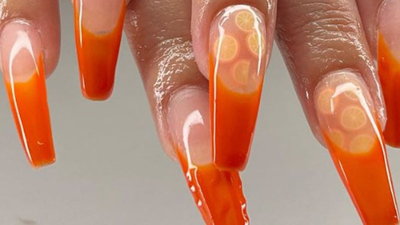 Ярко оранжевият лак е смесен с деликатни рисунки на резени мандарина на някои от ноктите.