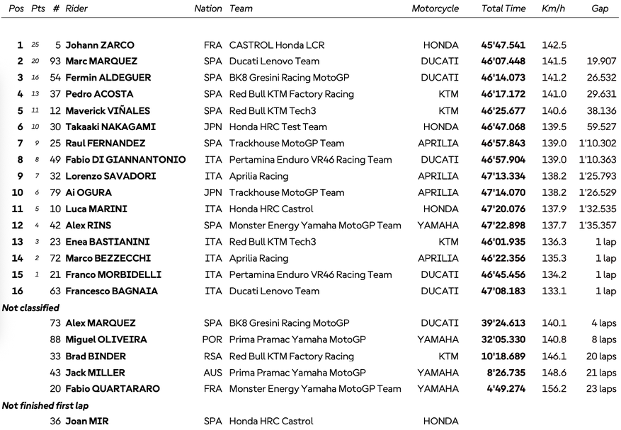 Трети в Льо Ман приключи Фермин Алдегер, който не се ориентира добре първоначално и закъсня с прекосяването към гумите за мокро, само че по-късно сподели доста мощно движение, с цел да стигне до почетната стълбичка. В нейното подножие финишира Педро Акоста, а топ 5 оформи Маверик Винялес.