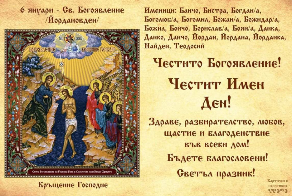 Имен ден имат: Йордан, Богдан, Йорданка, Данчо, Данка, Борил, Богомил, Бистра, Найден, Божидар, Божидара и техните производни.
