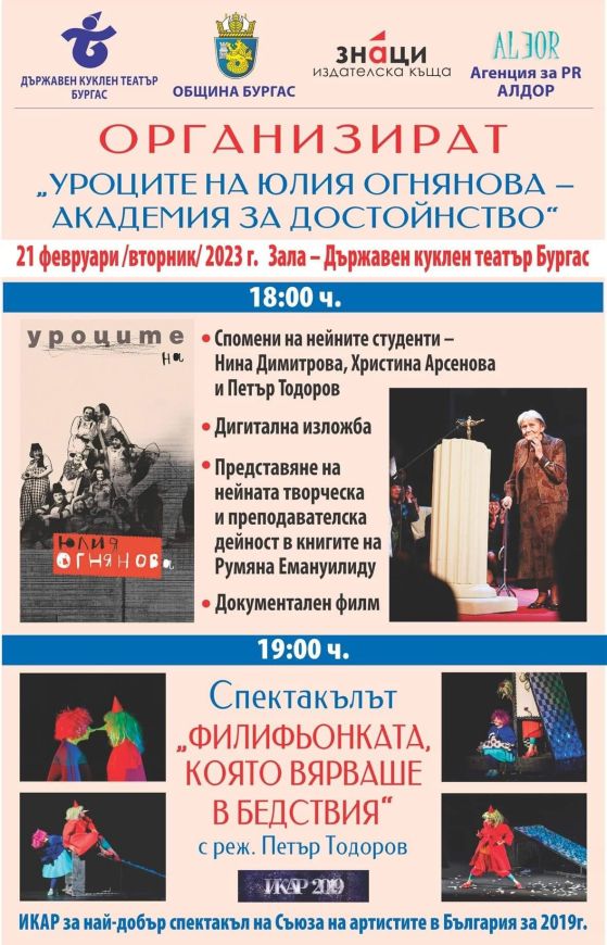 Вечерта в залата на бургаския куклен спектакъл ще продължи и с представянето креативната и преподавателска активност на Юлия Огнянова през книгите на Румяна Емануилиду, създател на издателска къща " Знаци ". Сред тях са " Уроците на Юлия Огнянова ", " Юлия и клоуните ", както и " Завещаното от Юлия Огнянова ".