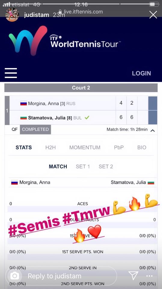 Стаматова, която е 708-а в международната класация, ще спори за място на финала с лидерката в главната скица Синди Бургер (Холандия), която направи поврат против №7 Шантал Скамлова, отстранявайки я с 3:6, 6:3, 6:3. Холандката сега е од №403-а в класацията на WTA, само че е достигала до №134 през ноември 2016 година. Източник: sportal.bg