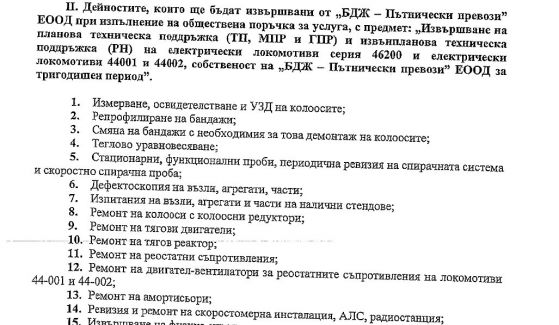 Фирмата, която завоюва контракта би трябвало да обезпечи техническо обслужване и ремонт на 9 от локомотивите на БДЖ през идващите три години. Според член 1 на проекто-договора, изпълнителят ще би трябвало да прави точно това.