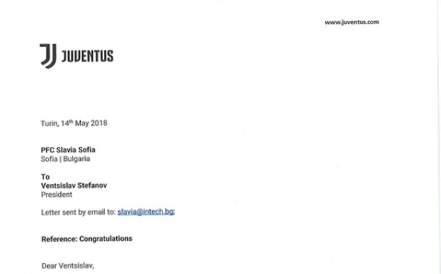 Ювентус изпрати особено приветствие до тима на Славия и президента на клуба Венцеслав Стефанов за спечелването на Купата на България. Както е известно, "белите " победиха Левски на финала след осъществяването на дузпи.