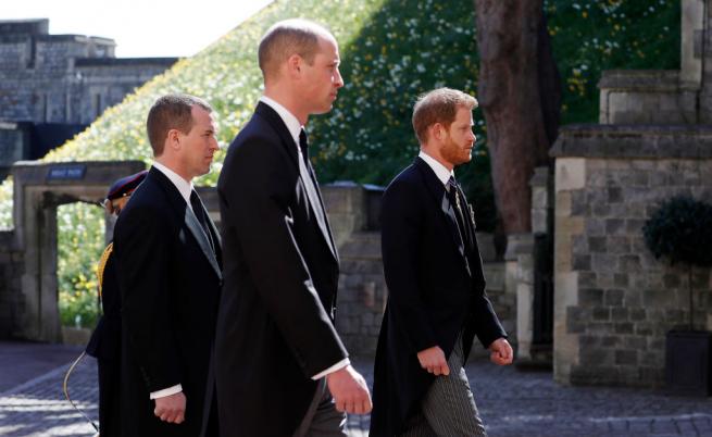 Както Уилям, по този начин и Хари участваха в шествието зад ковчега на принц Филип по пътя към параклиса "Сейнт Джордж ", а техният братовчед Питър Филипс беше разпределен сред тях. На излизане от храма камерите уловиха Уилям, Кейт и Хари да вървят дружно, до момента в който херцогинята отстъпва обратно, с цел да даде пространство на братята.