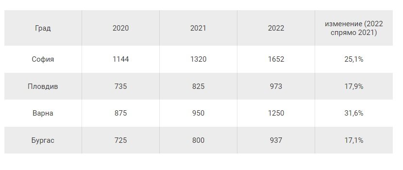 както и от локални поданици, само че и от задгранични жители и българи от чужбина. През 2022 година в границите на 1 месец се сключваха 73% от покупко-продажбите. Интересно е, че тристайните жилища към момента преобладават над двустайните, а малко над 30% от покупките се осъществят с заем, покриващ сред 81% и 100% от крайната стойност на договорката.