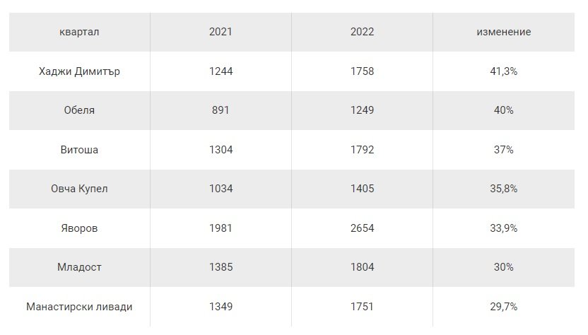 Като цяло кварталите с максимален растеж на цените са разрастващите се пазари. В някои от най-престижните региони като „ Иван Вазов “ и „ Изток “ равнищата порастват с по-малко от 10%. Най-осезаемо е покачването в квартали като " Обеля ", и Хаджи Димитър " - над 40%. В " Изгрев ", " Лозенец ", " Център ", Манастирски ливади " покачването е сред 20%-30%. Обяснението е, че главен мотор на пазара през 2021 и 2022 са основно новите планове, а терени за тях не се намират елементарно в центъра.