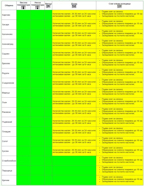 За 21 януари Национален институт по метеорология и хидрология разгласи Жълт код за превалявания и заплаха от поледици в областите Пазарджик, Пловдив, Смолян, Кърджали, Хасково, Стара Загора, Сливен и Ямбол.