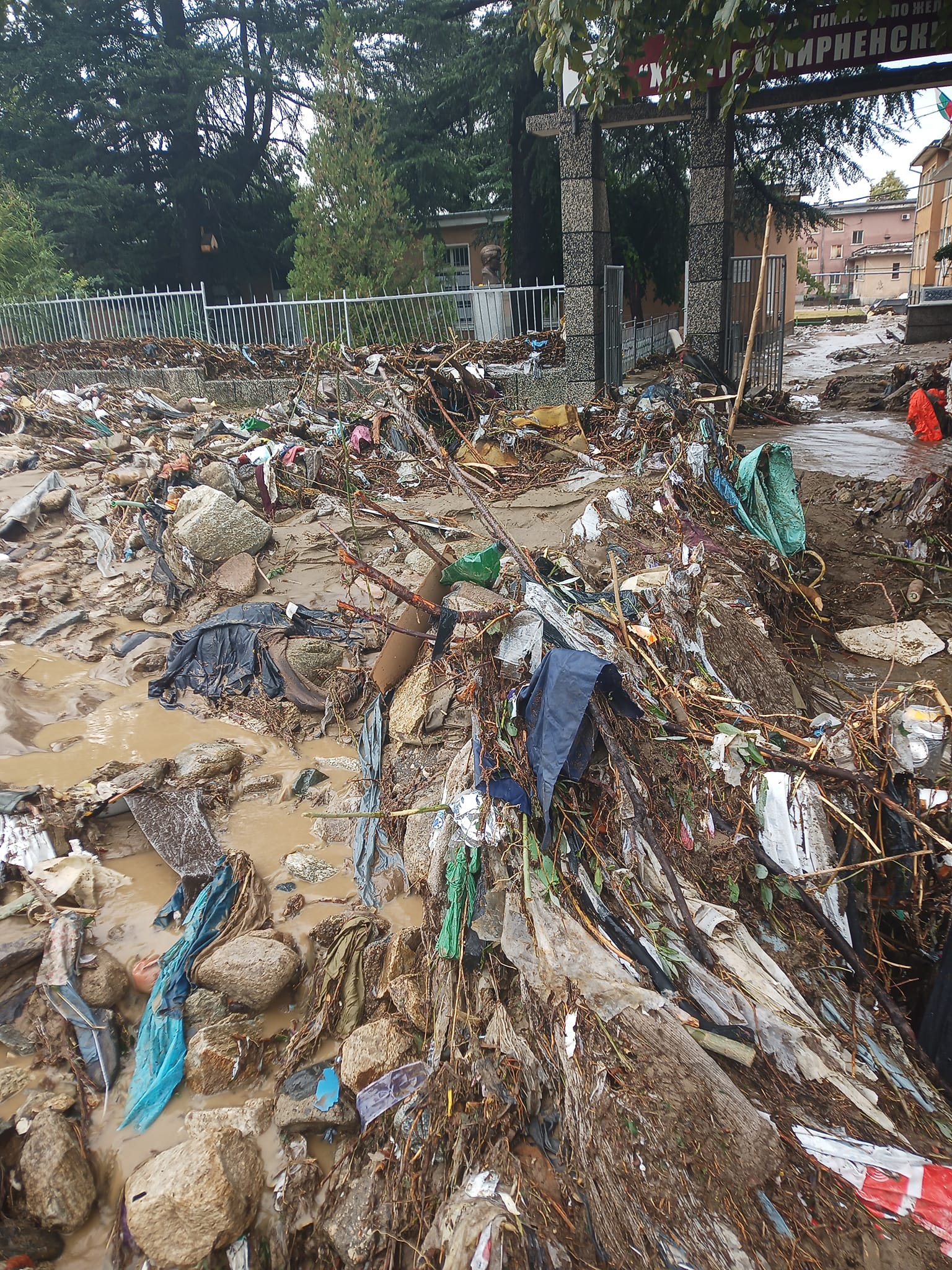 Директорът на Гимназията по превоз Стефан Филчев разгласява фрагменти от учебното заведение, където бяха блокирани трима души. Първите етажи на школото са под вода, а големи вреди има по постройката и двора му.