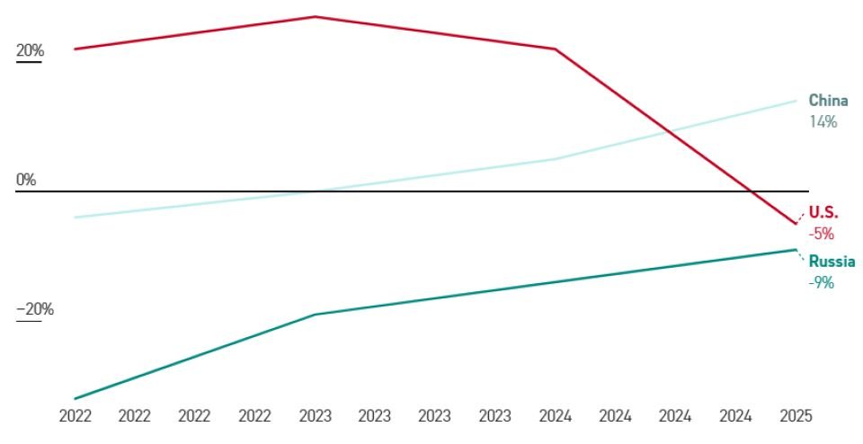 Сега Съединени американски щати не изостават доста от Русия, чийто % е -9%. През 2022 година, годината на нахлуването на Русия в Украйна, съветският показател се срина до -32%. Оттогава показателят се възвърне отчасти, което може да е повлияно от дейната съветска агитация в страните от „ световния юг “, умората от войната и възхода на крайнодесни политически придвижвания в западните страни, които нормално симпатизират на „ мощните водачи “ като цяло и на Путин в частност.