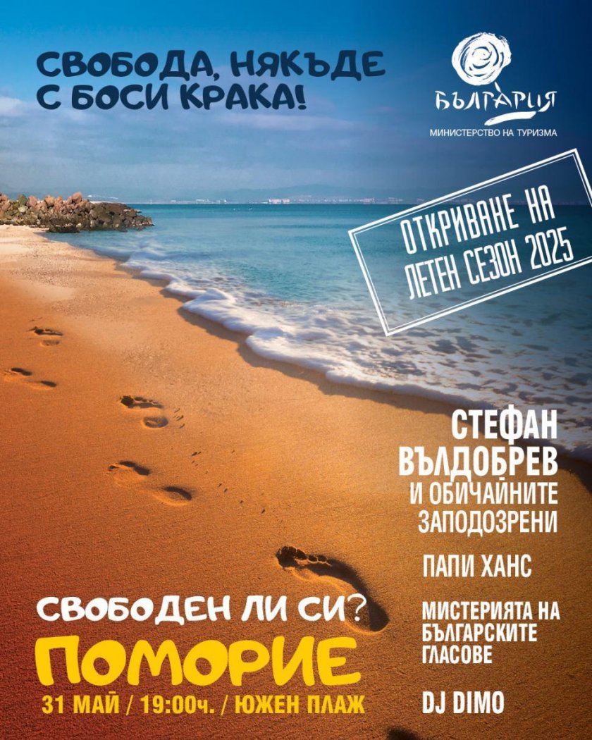 Събитието на 31 май, проведено от Министерството на туризма и община Поморие, ще даде старт на летния туристически сезон с концерт на Южния плаж в Поморие. В програмата ще се включат Стефан Вълдобрев и „ Обичайните обвинени “, Папи Ханс, „ Мистерията на българските гласове “, DJ Dimo и още обичани актьори. Концертът стартира в 19:00 часа, предлагайки празненство под намерено небе край морето. Входът е свободен, което прави събитието съвършен мотив за събиране и празнуване на настъпващото лято.
