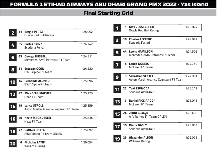Този път и двете купа от дълго време са решени, а от полпозишъна в Абу Даби ще старти международният първенец Макс Верстапен. До него на първия ред ще застане съотборникът му в Ред Бул Серхио Перес, който е с еднакъв брой точки с Шарл Леклер в борбата за позицията на подгласник на Верстапен. Монегаскът ще потегли от третата позиция на стартовата решетка през днешния ден.