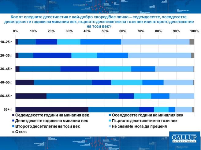 Нещо се пречупва в публичните усещания по отношение на деветдесетте, считат анализаторите от „ Галъп интернешънъл “. Поколението сред 36 и 45 години, от което се чака в най-голяма степен да възприема 90-те години като най-хубави, е по-скоро раздвоено. Същото важи и за поколението сред 26 и 35-годишна възраст. Над две трети от запитаните сред 26 и 35 години не могат да преценяват кое десетилетие е най-хубаво за тях. Една пета от запитаните сред 36 и 45 години – също.