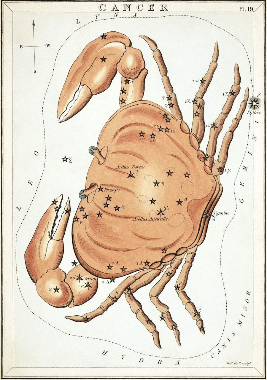* Cancer as depicted in Urania's Mirror, a set of constellation cards published in London c.1825. By Jehoshaphat Aspin, en.wikipedia.org