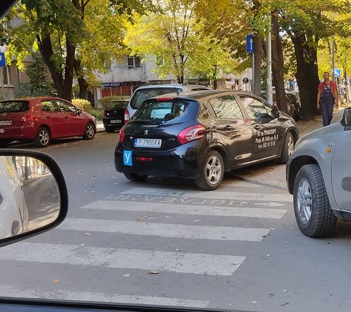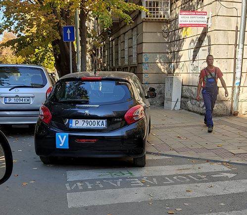 Колата е ситуирана напречно на пешеходна пътека, а част от предницата е на тротоара. От споделените фрагменти се вижда, че вътре има курсист.