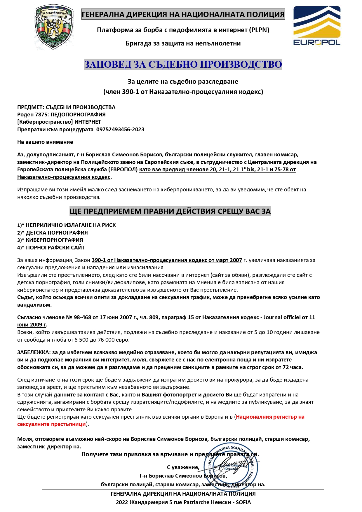 Съобщения гласят, че жертвите са обект на следствие, обвързвано с детска порнография, заради което следва да заплатят избрана сума, с цел да бъде прекъснато наказателното гонене против тях. Много от получателите на тези имейли са разпознали измамата и са уведомили формалните си национални управляващи или Европол. Белгийските управляващи са почнали публично следствие.