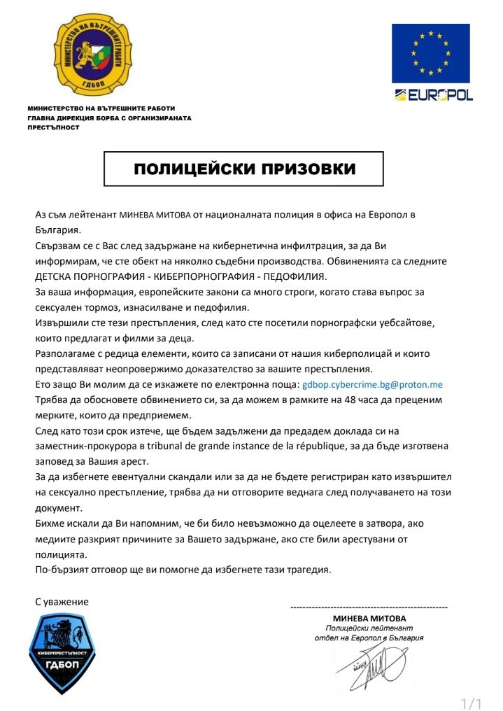 За нова машинация с имейли от името на публични европейски или национални правоохранителни институции, предизвестяват от Министерство на вътрешните работи.