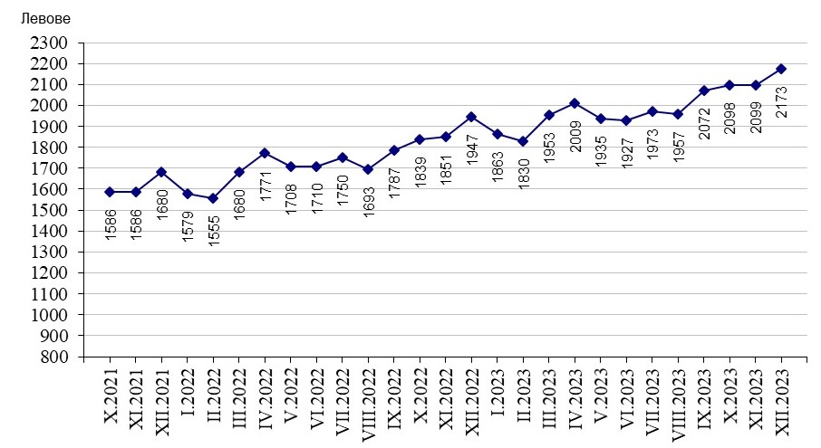 за октомври 2023 година е 2 098 лева, за ноември - 2 099 лева и за декември - 2 173 лв.., демонстрират данните на Националния статистически институт.