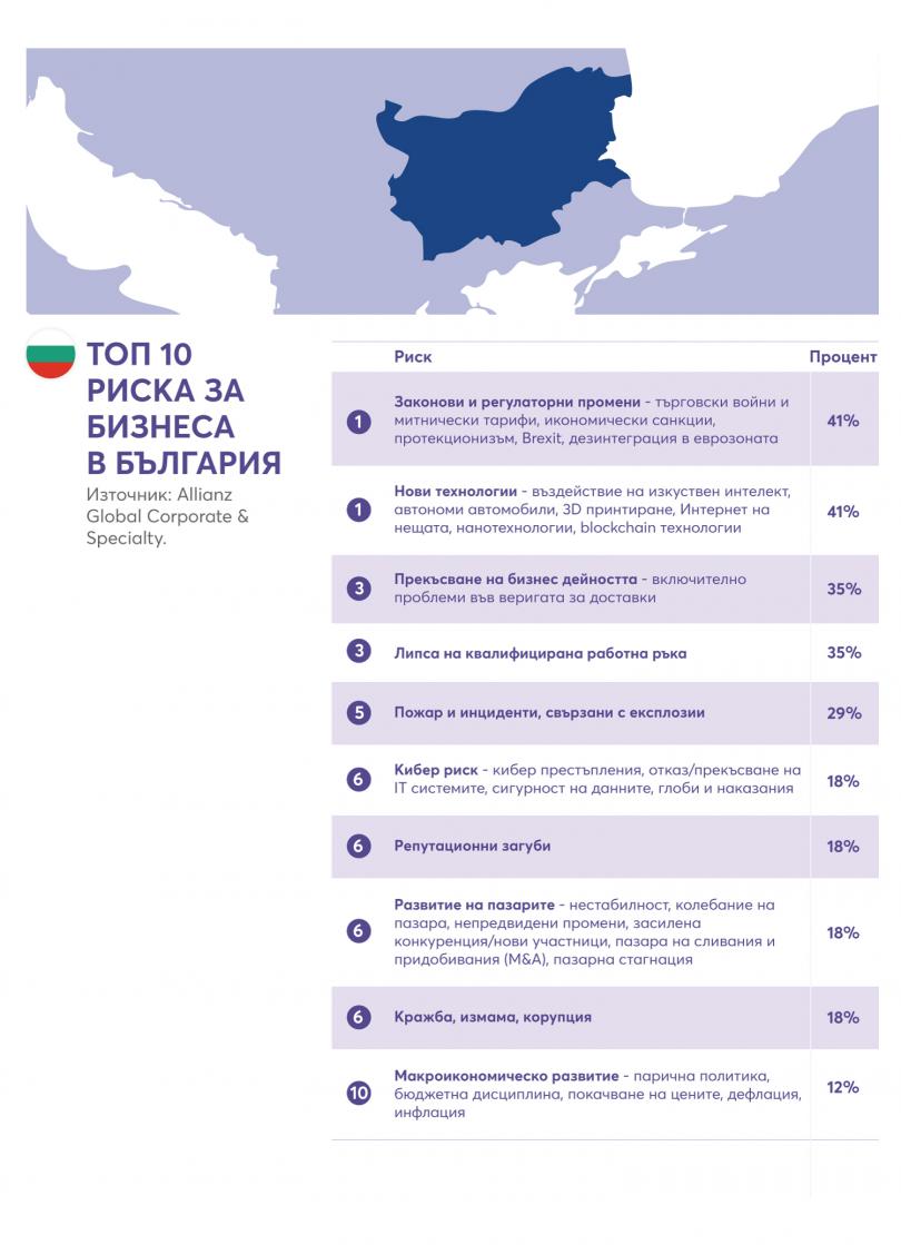 Проучването разпознава като най-съществени за бизнеса рисковете, пред които ни изправят законовите и регулаторни промени, както и новите технологии. И двете категории си поделят първото място с по 41% от далите отговор. Българските специалисти правят оценка като рискови за бизнеса комерсиалните войни, митническите цени, икономическите наказания, протекционизма, Brexit, дезинтеграцията в еврозоната. Не по-малко предизвикателни за фирмите в България са въздействието на изкуствения разсъдък, самостоятелните коли, „ Интернет на нещата “ (IoT), блокчейн и нанотехнологиите.