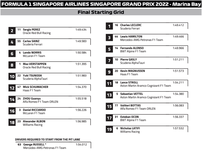 За първи път от 2019 година насам пистата „ Марина Бей “ приема старта от Формула 1, откакто през 2020 и 2021 Гран При на Сингапур бе анулирана поради пандемията от ковид.
