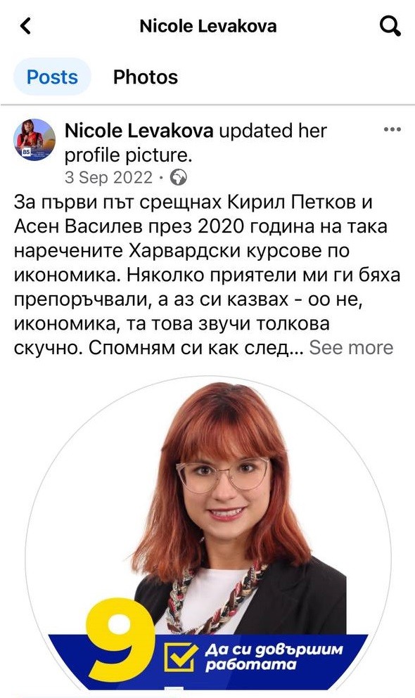 „ За първи път срещнах Кирил Петков и Асен Василев през 2020 година на по този начин наречените Харвардски курсове по стопанска система. Бях координатор към щаба на 25 МИР на изборите през ноември 2021 година. През януари станах помощник към депутат “, написа актуалният старши специалист към Столична община Никол Левакова в Linkedin, когато афишира, че е претендент за депутат от Политическа партия. Вероятно става въпрос за същите „ Харвардски курсове “, на които е участвала и кандидат-депутатката от „ Продължавме смяната “ Габриела Славова-Пеева, която преди дни умъртви и възпламени брачна половинка си.