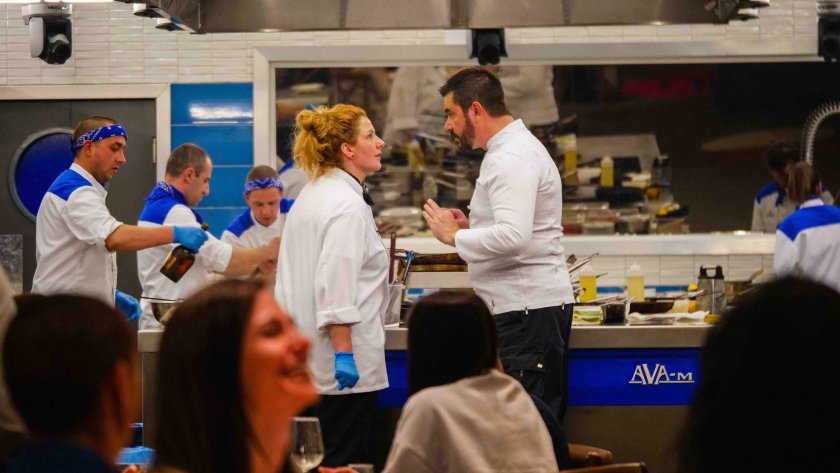 Съюзници на Валентина в Синята кухня станаха Камен, Елена, Мартин и Артур, а на Виктория в Червената кухня – Николай, Мариела, Анелия и Андреа. Двата тима готвиха по авторските менюта на водачите си с черни куртки. Сините „ захарчета “ на Валентина издаваха поръчките със светкавична експедитивност, само че тимът на Виктория набра преднина с десертите и двете кухни приключиха резервациите си наедно. Анкетните карти, които началник Ангелов беше раздал на гостите му помогнаха в тежкото решение и Валентина се трансформира в кралицата на четвърти сезон на " Хелс Китчън ".