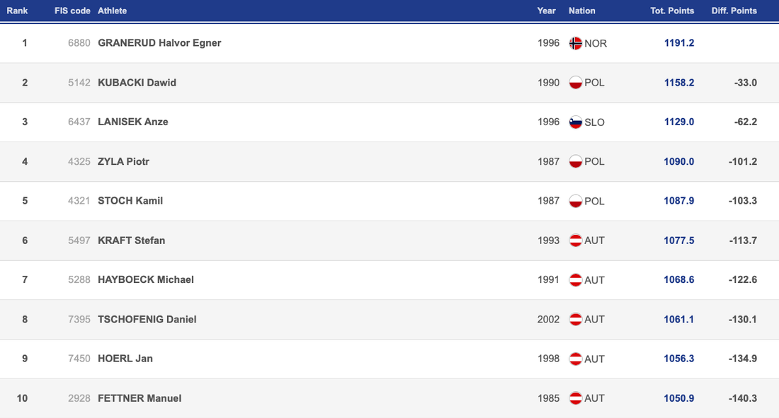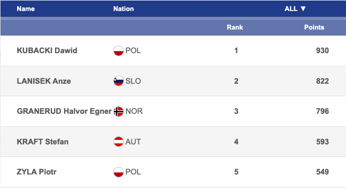 В класирането за Световната купа водач с 930 точки продължава да бъде Кубацки, следван от Ланишек с 822 и Гранеруд със 769.