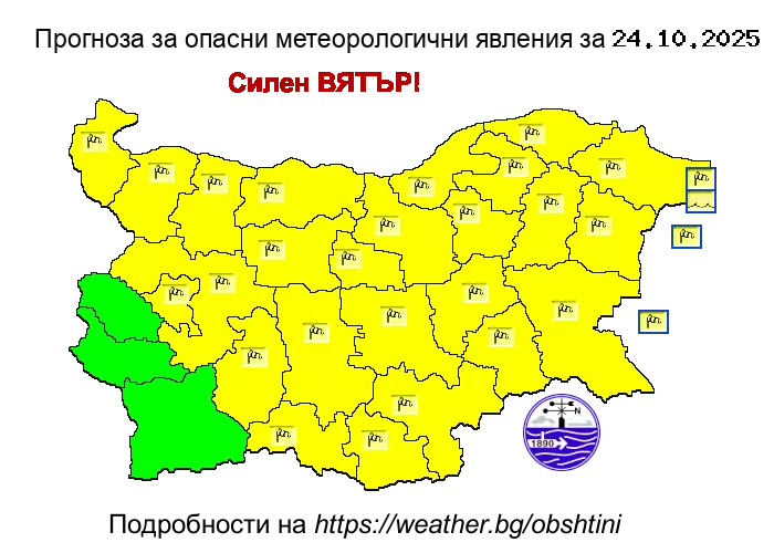 За петък /24 октомври/ Национален институт по метеорология и хидрология разгласи жълт код за мощен и плевел вятър в съвсем цялата страна. Изключението са областите Перник, Кюстендил и Благоевград. Очаква се в другите региони поривите напразно да доближават 60-70 километра в час. В Пловдив област ще бъдат наранени съвсем всички общини, като се изключи Карлово и Сопот. Скоростта на вяръта ще бъде 50-69 km/h, като се чакат и поривите да доближават до 90 km/h.