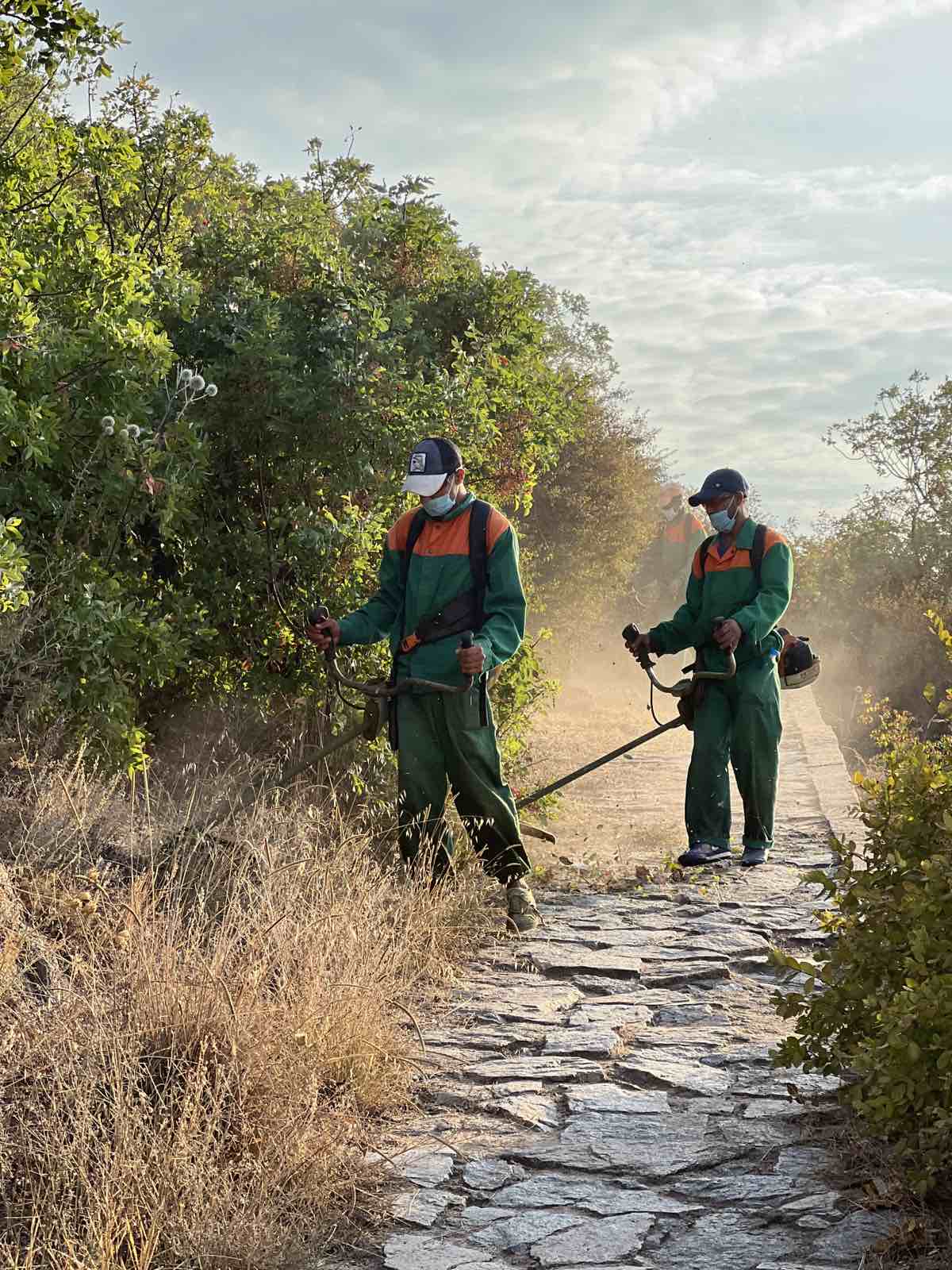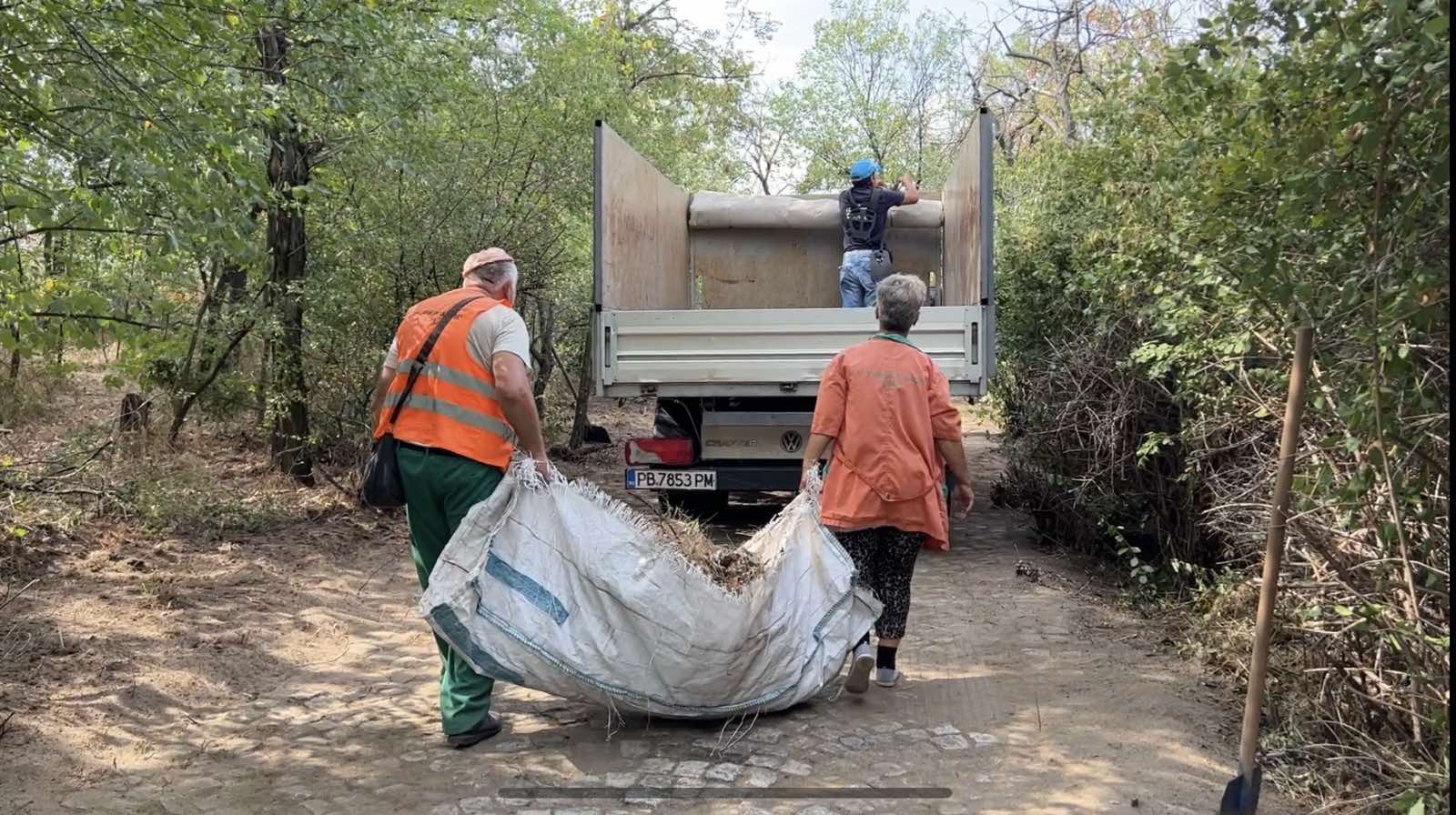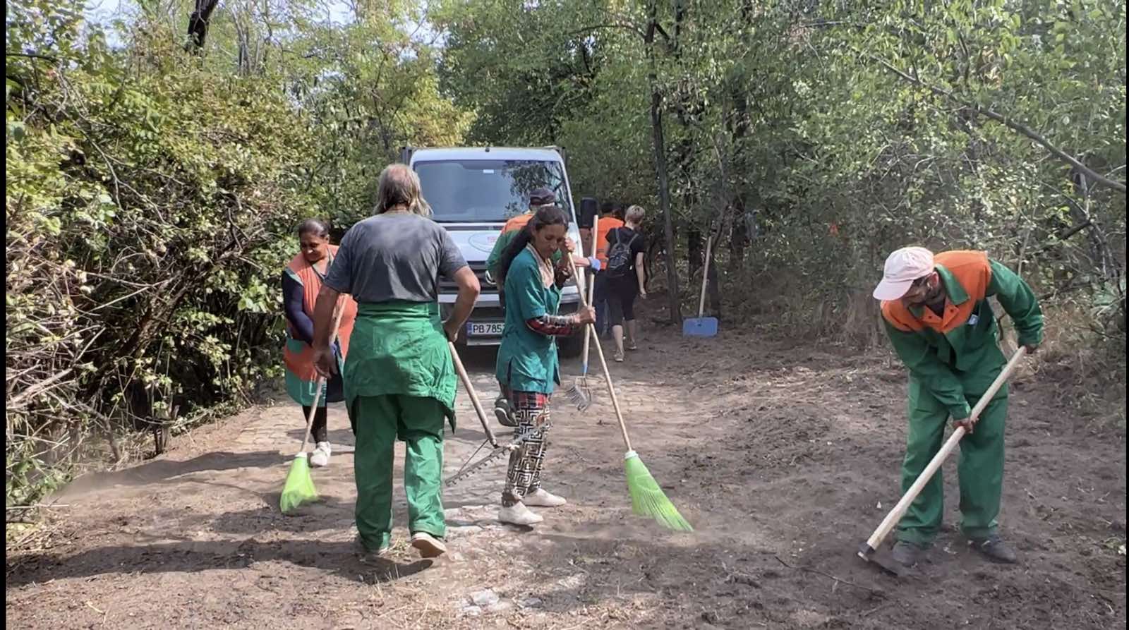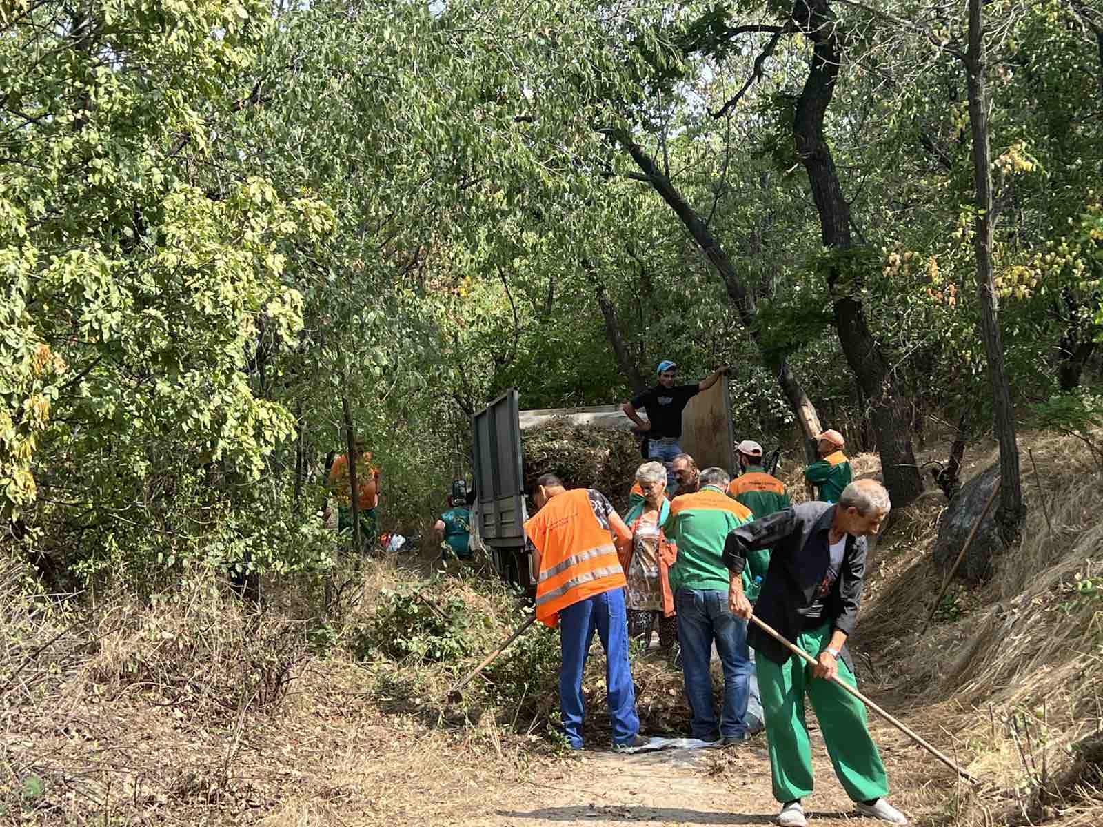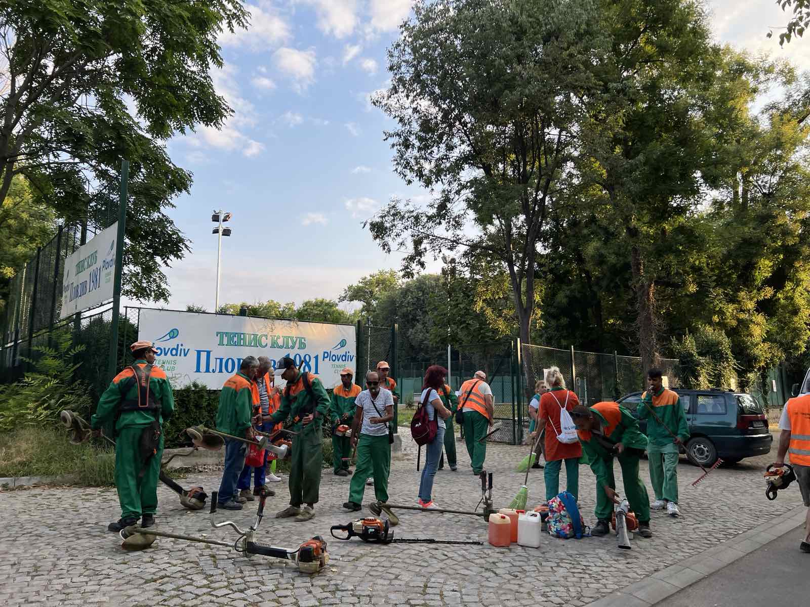 Още от 7 часа сутринта служащи с косачки и храсторези започнаха да отстраняват избуялата върху пешеходни алеи растителност. След тях разчистваха чиновници от дребната на брой администрация, някои от които обаче бяха пристигнали с задачите си фамилии.