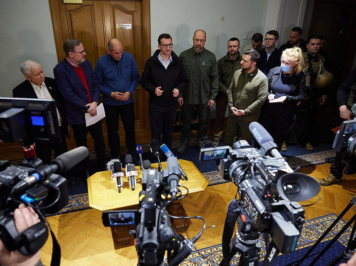 " Старшият брат " одобри да поддържа морално " младшия ". Киев, 15 март, 2022 година. Ярослав Качински (в ляво, в бяло) с премиера Матеуш Маревцки (с очилата) в центъра. Това отразява новото разположение на силите в полската политика.
