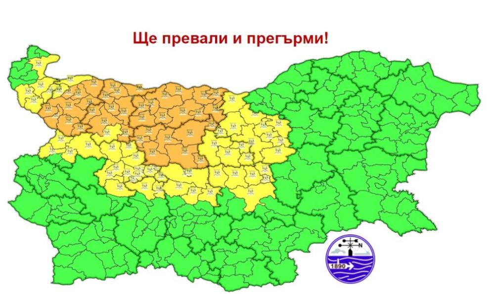 За понеделник е разгласен оранжев код за рисково време - дъжд и гръмотевици, за четири области на страната. Кодът е в действие за Монтана, Враца, Ловеч и Плевен. В други седем области е разгласен жълт код - Видин, София, Пазарджик, Пловдив, Габрово, Стара Загора и Велико Търново.