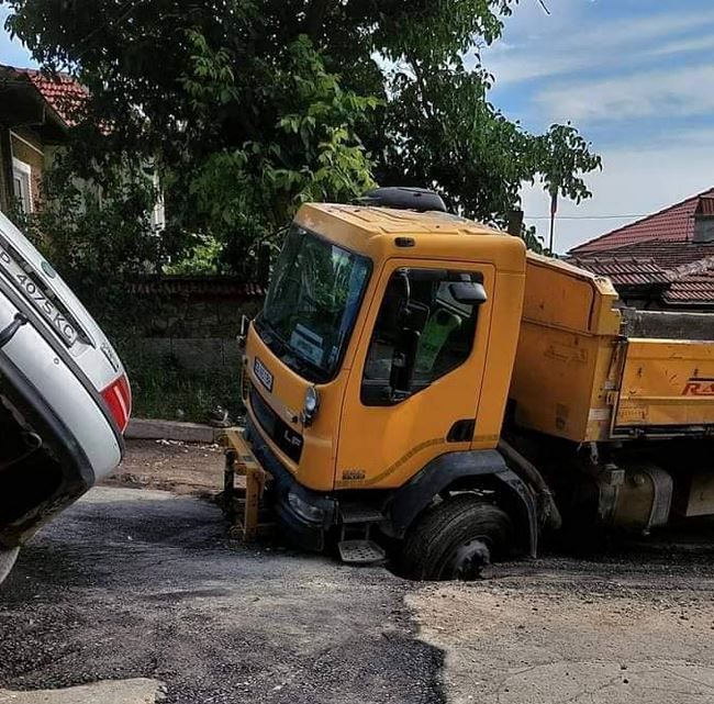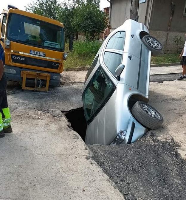За следващ случай на пътя алармират жителите на Русе. Кола е пропаднала в голяма дупка на една от улиците в града. На метри от нея заседнал и камион.
