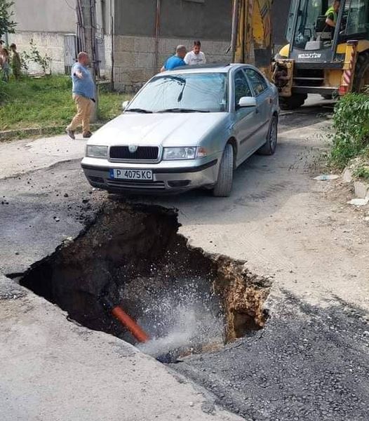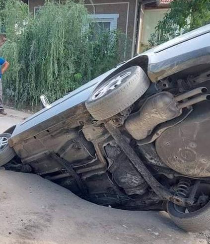 Сива " Шкода " е пропаднала през настилката в ров, който е бездънен най-малко половин метър. Колата е извадена благодарение на екскаватор.