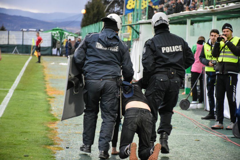 " Във връзка със свидетелски показания за това, че на футболна среща в гр. Благоевград млад мъж е хвърлил пиратка в краката на майка с две деца, които мощно се изплашили, а седалка на стадиона се е възпламенила, от полицейски чиновници е пристъпено към извеждане на 19-годишен мъж, който не се подчинил на полицейско предписание и е оказал опозиция.