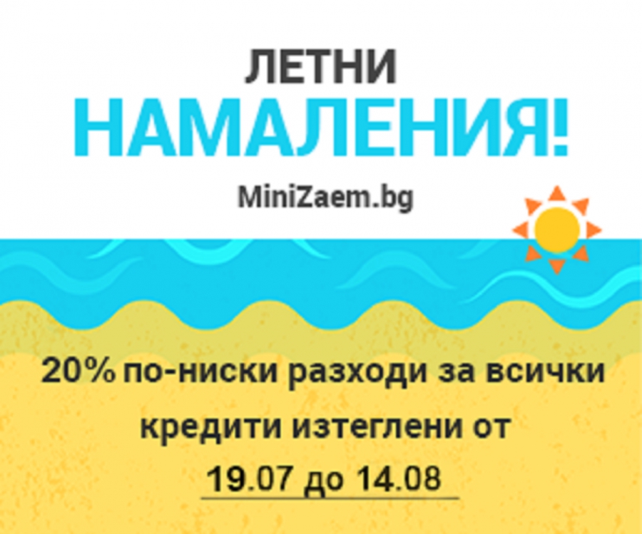 От 19.07.2021 година всеки, който реши да изиска заем от Мини Заем ще му бъде възложен с 20% отстъпка. Кампанията ще продължи до 14.08.2021 година. Отстъпките са за всички онлайн заеми (до заплата и на вноски), а от тях могат да се възползват всички клиенти на кредитната институция.