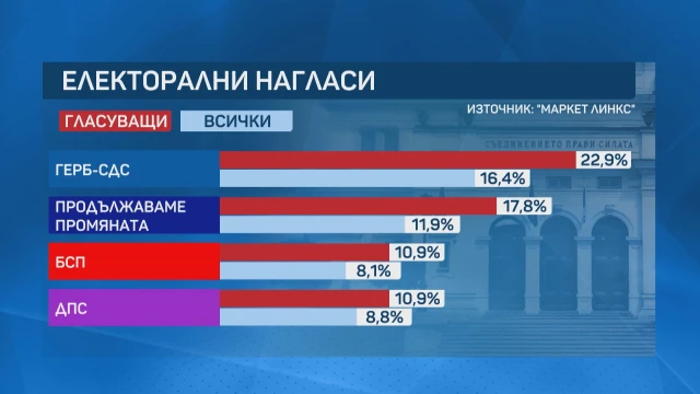Ето и резултатите от последното изследване на " Маркет линкс ", което е финансирано и осъществено взаимно с bTV. Допитването е извършено измежду 1067 души в интервала 27 август - 3 септември по методите на директното персонално изявление и онлайн анкета.